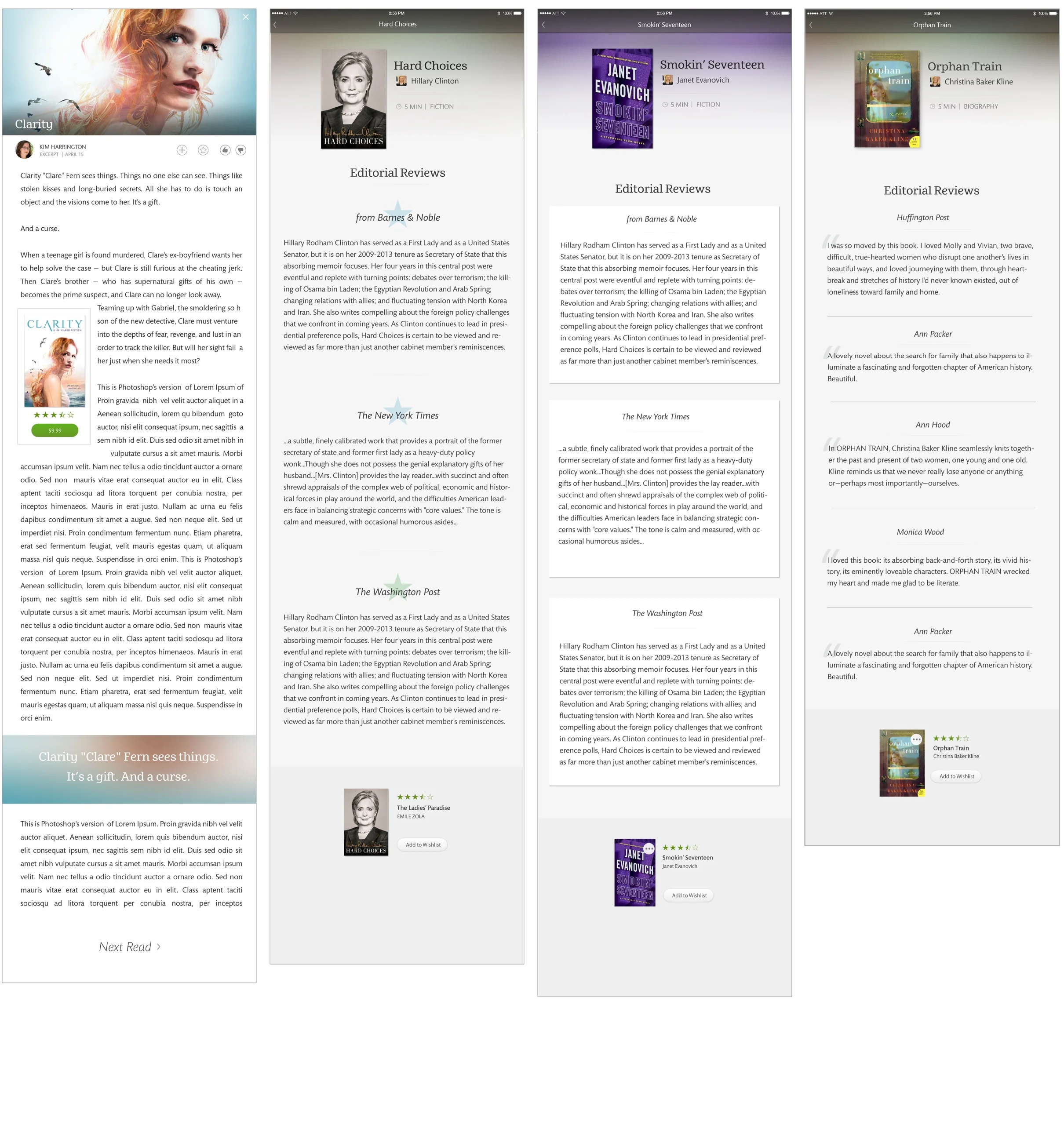 As the initial ux/design team disbursed and moved onto other opportunities outside the NOOK design team I continued to expand, iterate and polish the visual language. Each NOOK feature area still had to be thought through and our new visual language needed to be applied across the entirety of all NOOK devices and sizes.
